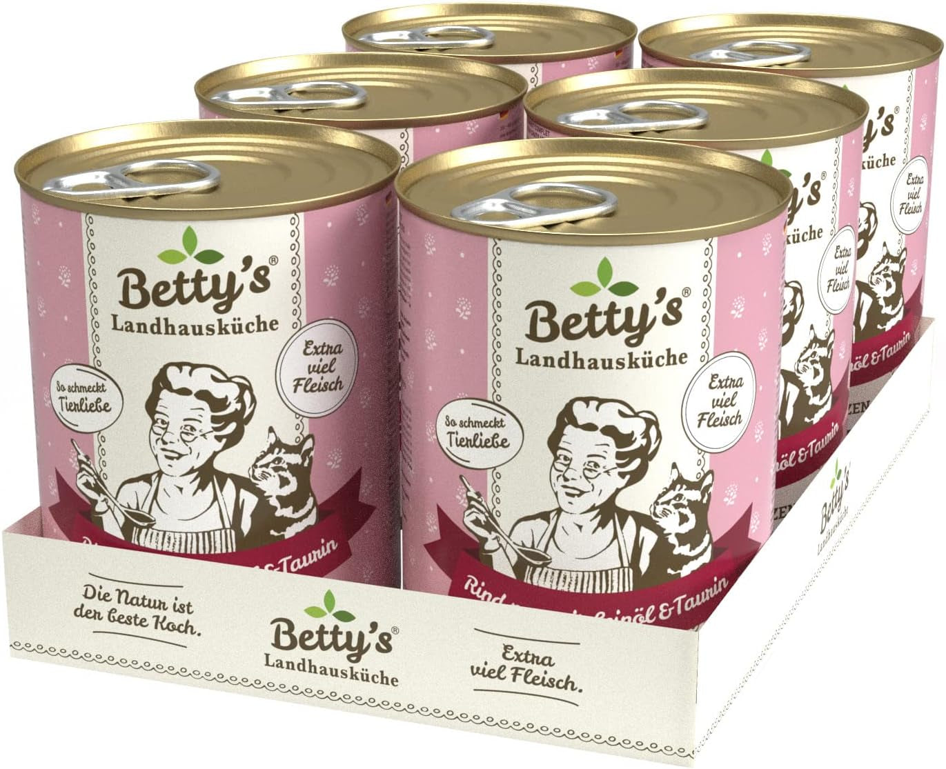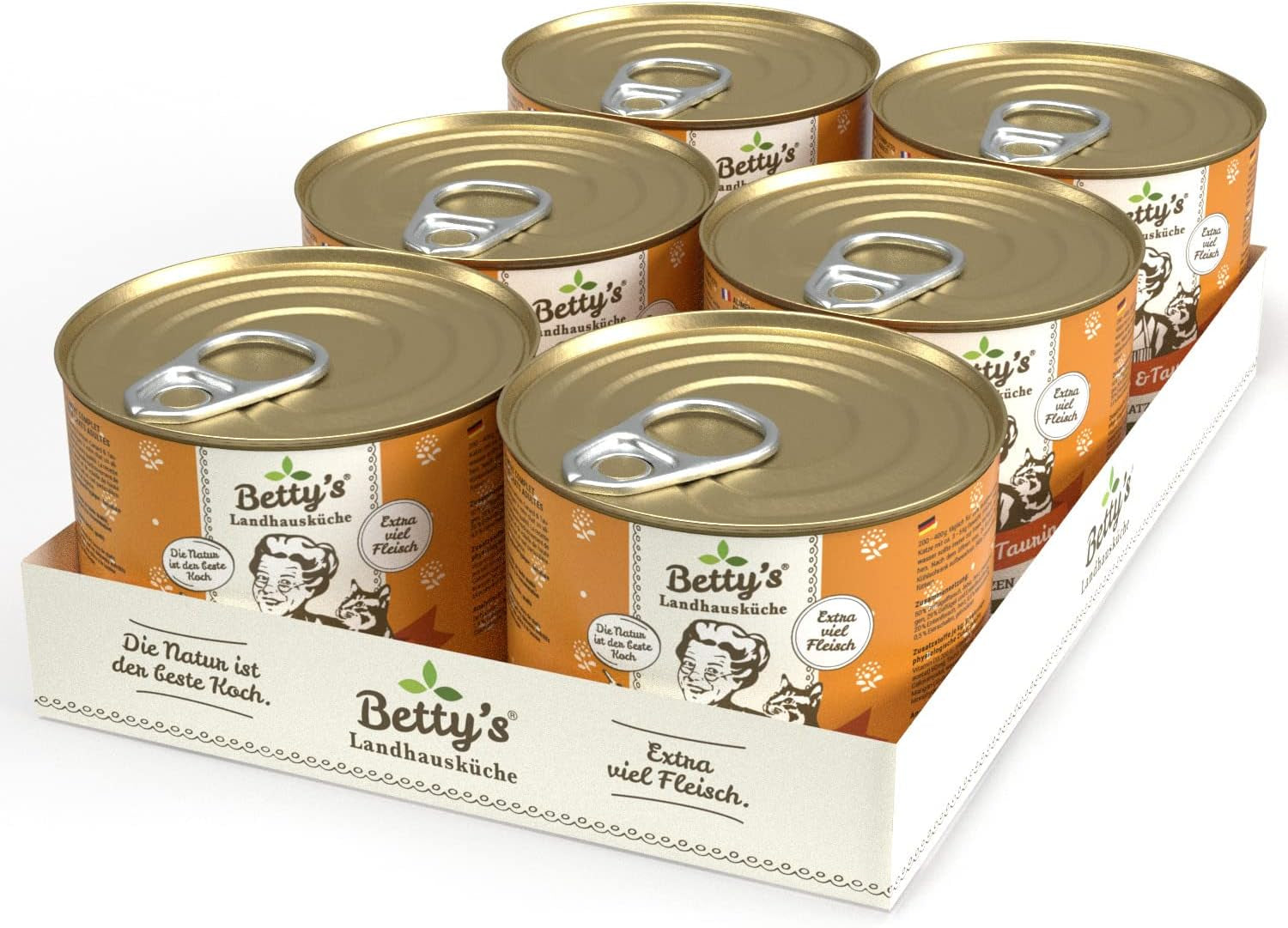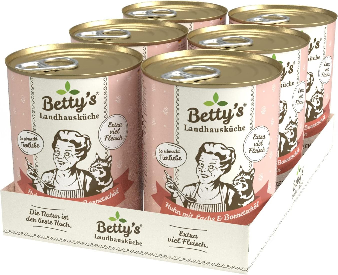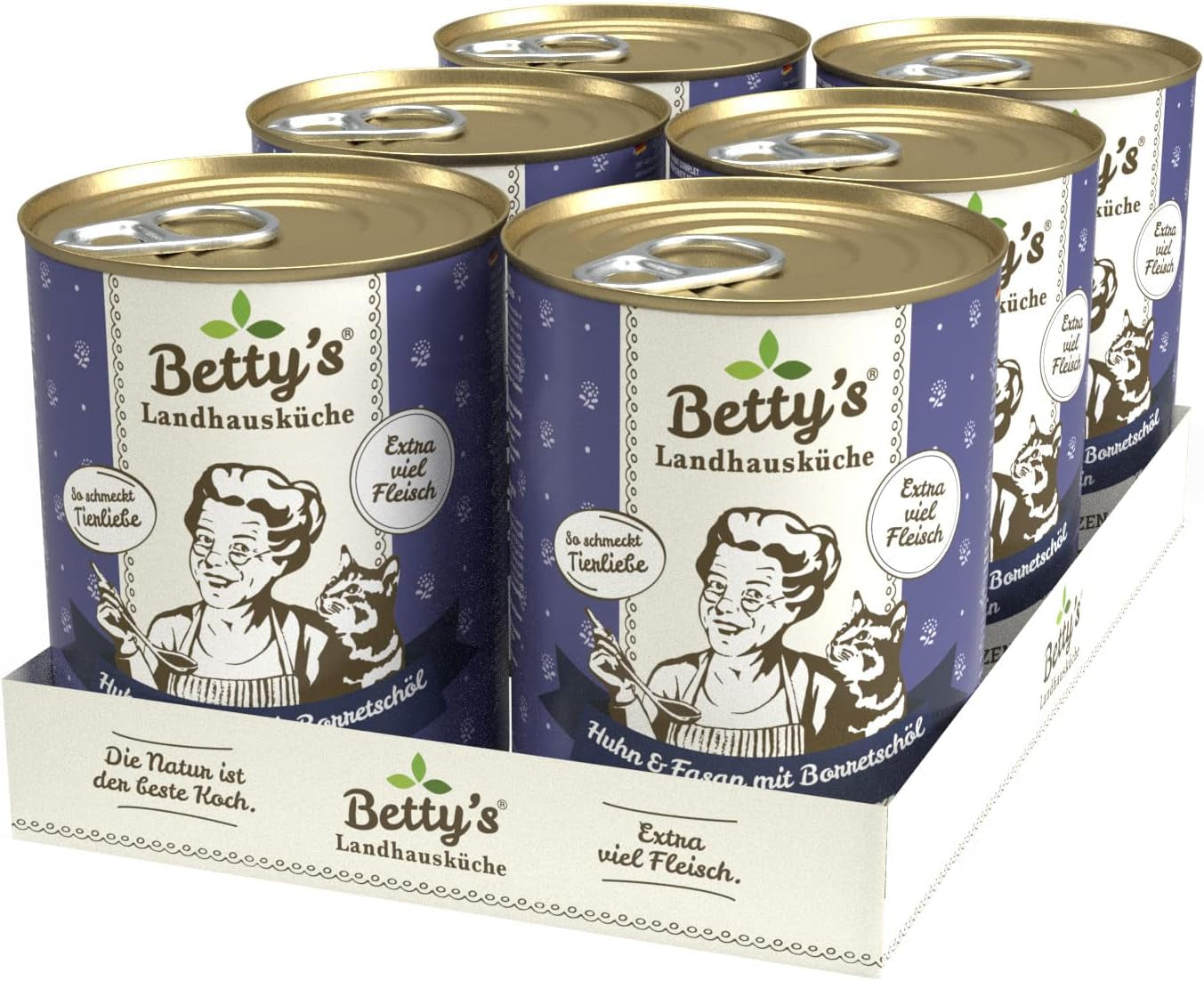 Betty'S Landhausküche cutie de hrană umedă pentru pisici, Fără cereale, Cea mai bună calitate, Carne de înaltă calitate, Gently cooked, Potrivit pentru toate rasele de pisici, Pui și fazan cu ulei de borangic 6 X 200 G -