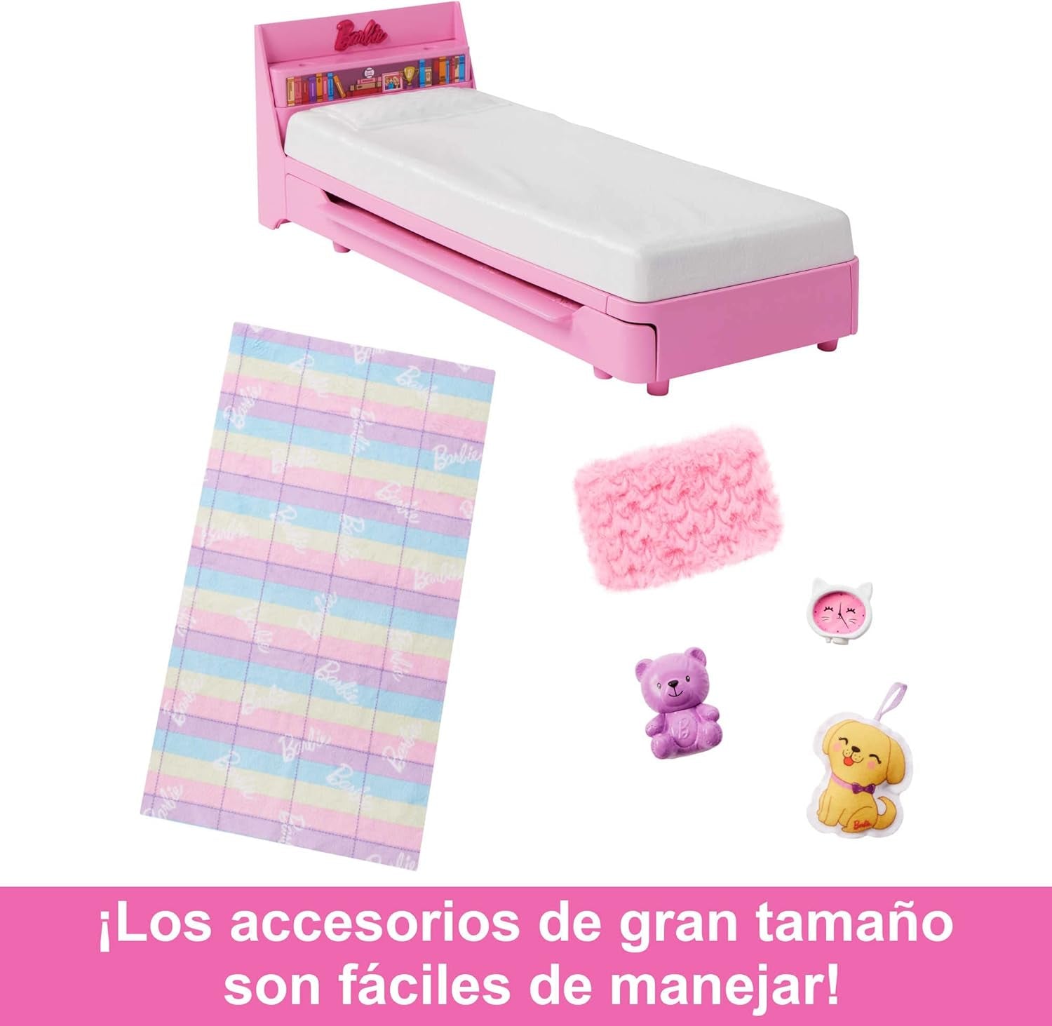 Barbie My First Series, Pat rulant, Pat cu accesorii, Ceas cu alarmă, Ursuleț de pluș, Set negru, Pernă, Păpușă, Cadou pentru copii, Jucării de la 3 ani,Hmm64