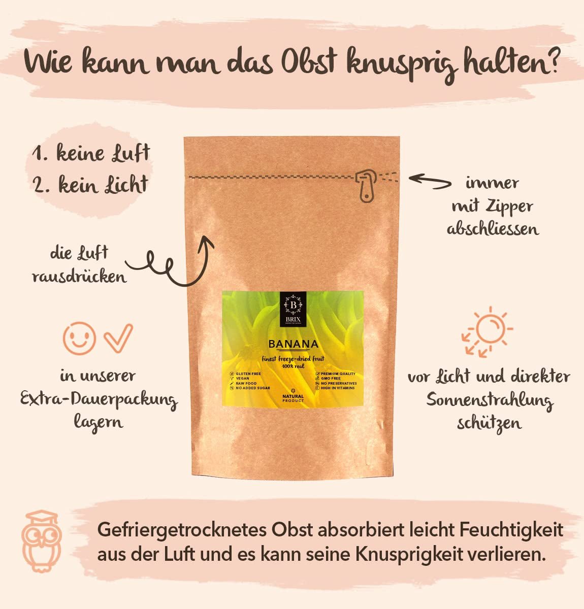 - 100% FRUCTE LIOFILIZATE - Banane liofilizate fără adaos de conservanți sau zahăr. Liofilizarea elimină apa din fructe. Cu toate acestea, culoarea, aroma, structura și compoziția lor, adică toate proprietățile fructului, sunt păstrate, iar aroma lor devine mai intensă. DELICIOUS HEALTHY SNACK - Snack sănătos inovator pentru copii și adulți. De asemenea, ideal ca topping pentru micul dejun muesli și smoothie-uri. Potrivit pentru vegetarieni, vegani și raw foodists, fără gluten.