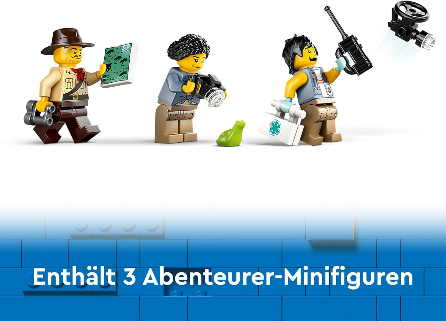 Camion LEGO City Jungle Explorer, set de construit și jucat pentru copii de peste 6 ani, cadou grozav pentru ziua de naștere, camion de jucărie, cu 3 minifigurine Adventurer și tigru 60426