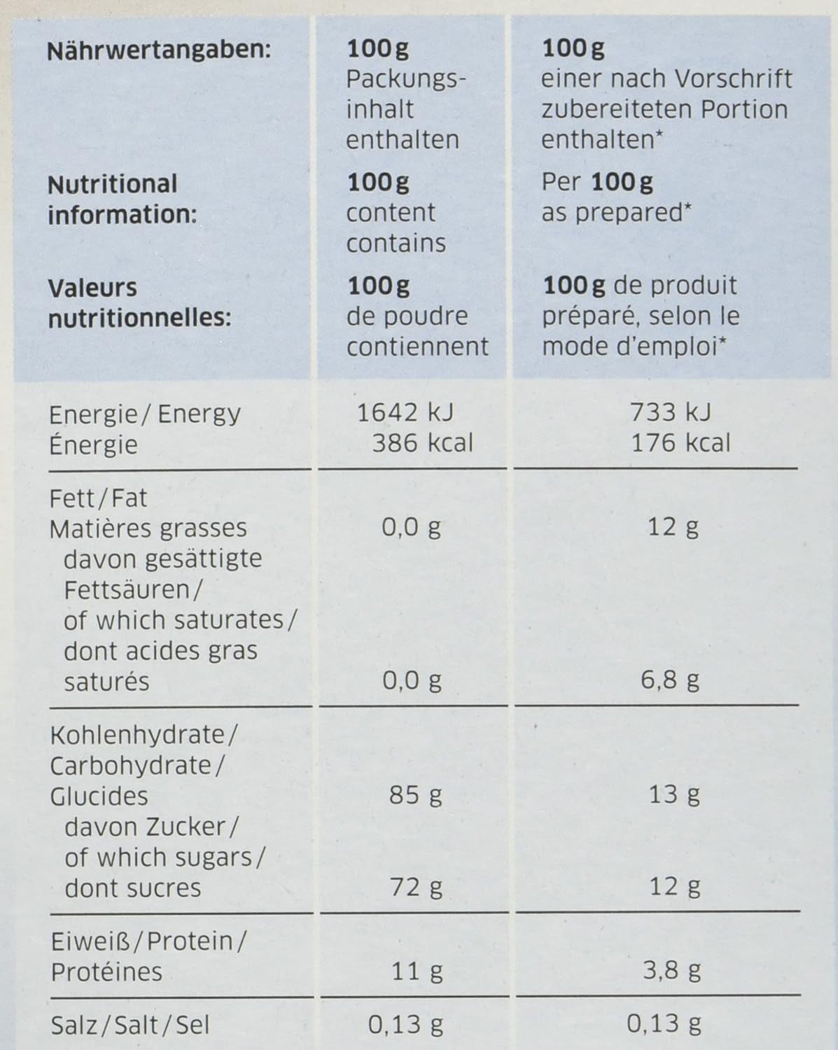 - Zubereitung: Milch und Sahne aufkochen und vom Herd nehmen, Pulver bis zur vollständigen Auflösung mit einem Schneebesen in die heiße Flüssigkeit einrühren, Anschließend portionieren und über Nacht kaltstellen