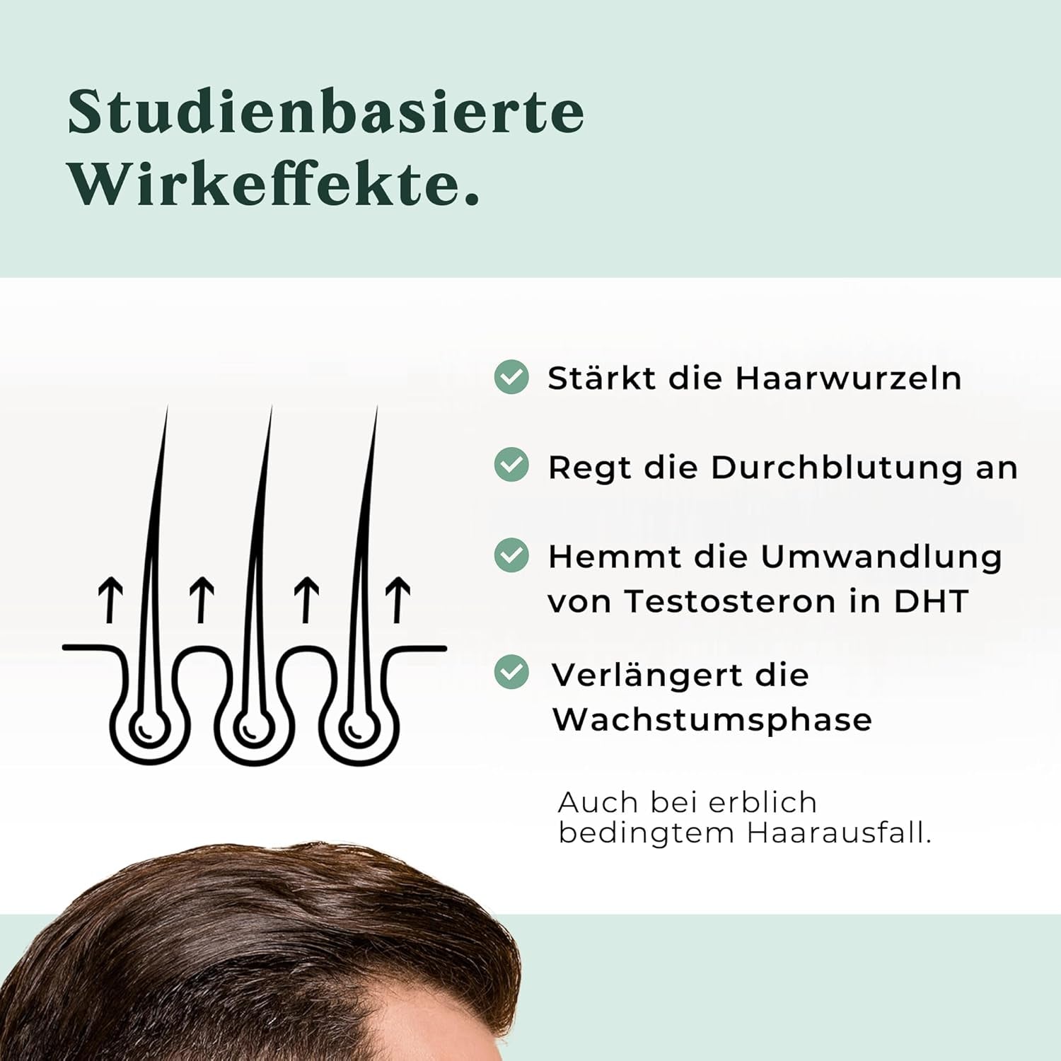 RootBioTec inhibă enzima 5α-reductază II, care este necesară pentru transformarea testosteronului în dihidrotestosteron (DHT). La rândul său, cafeina blochează DHT. Concentrațiile ridicate de DHT sunt principala cauză a căderii ereditare a părului.