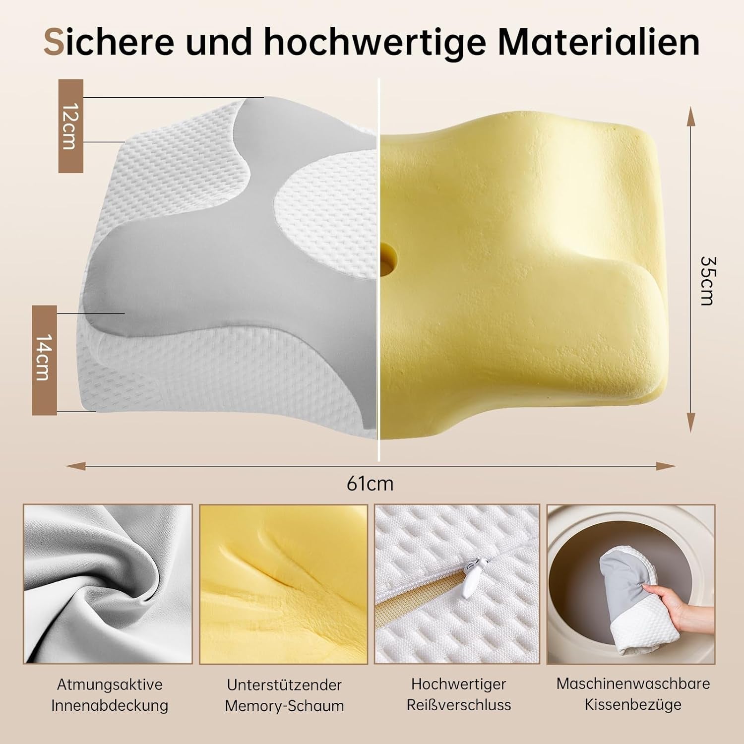 - DESIGNERGONOMIC: Această pernă ergonomică pentru gât oferă echilibrul perfect între susținere și confort. Cu șase zone de formă unică, conturul sofisticat al pernei fluture se mulează perfect pe curbele umerilor și gâtului, asigurând că capul, gâtul, umerii și spatele sunt perfect susținute, astfel încât să vă puteți odihni bine pe tot parcursul nopții, să dormiți mai bine și să ameliorați durerile de gât și umeri și stresul. (Spre deosebire de alte produse similare, zona de susținere a gâtului a pernei noastre nu iese excesiv în afară, ceea ce înseamnă că umerii nu sunt susținuți de pernă.) DOUĂ OPȚIUNI DE ÎNALȚIME: Perna noastră ortopedică din spumă de memorie are două înălțimi diferite pentru a alege de pe ambele părți. Înălțimea părții joase este de 12 cm, capul și coloana cervicală au un sentiment mai puternic de învăluire, mai potrivit pentru dormitul pe spate. Înălțimea părții înalte este de 14 cm, cele două părți ale pernei de colț sunt mai mari și sunt mai potrivite pentru dormitul lateral și pe burtă. Puteți alege unghiul și înălțimea care vi se potrivesc cel mai bine, în funcție de obiceiurile dvs. obișnuite de dormit.FULFILL MULTIPLE SLEEPING POSITIONS: Datorită designului excelent al conturului și designului pernei unghiulare, această pernă este potrivită pentru diferite poziții de dormit. Atunci când dormiți pe spate, coborârea din centrul pernei susține inteligent capul și menține curbura naturală a gâtului pentru a alinia perfect coloana vertebrală. Atunci când dormiți pe o parte, adânciturile de pe ambele părți ale pernei înclinate permit brațelor să intre confortabil în adânciturile pernei. Când dormiți pe stomac, brațele pot fi înfășurate în jurul celor două perne înclinate pentru a oferi un sprijin perfect.HIGH QUALITY MEMORY FOAM: Perna de gât din spumă cu memorie este fabricată din spumă cu memorie de înaltă calitate, cu densitate ridicată și reacție lentă. Miezul pernei a fost ușor ridicat și rigidizat pentru a rezolva problemele pernelor convenționale din spumă de memorie cu deformabilitate ușoară și lipsă de suport. Oferă confort maxim în timpul somnului, își păstrează forma și realizează un echilibru perfect între moliciune și duritate, ceea ce o face durabilă. Nu conține substanțe toxice, dăunătoare sau dăunătoare. (Notă: Nu spălați spuma cu memorie.)