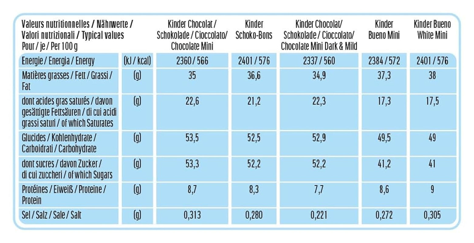 - Pachetul mare conține 5 arome diferite pentru momente suplimentare de răsfăț: Kinder Schokolade Mini, Kinder Bueno Mini, Kinder Bueno White Mini, Kinder Schokobons și Kinder Schokolade Mini Dark și Mild