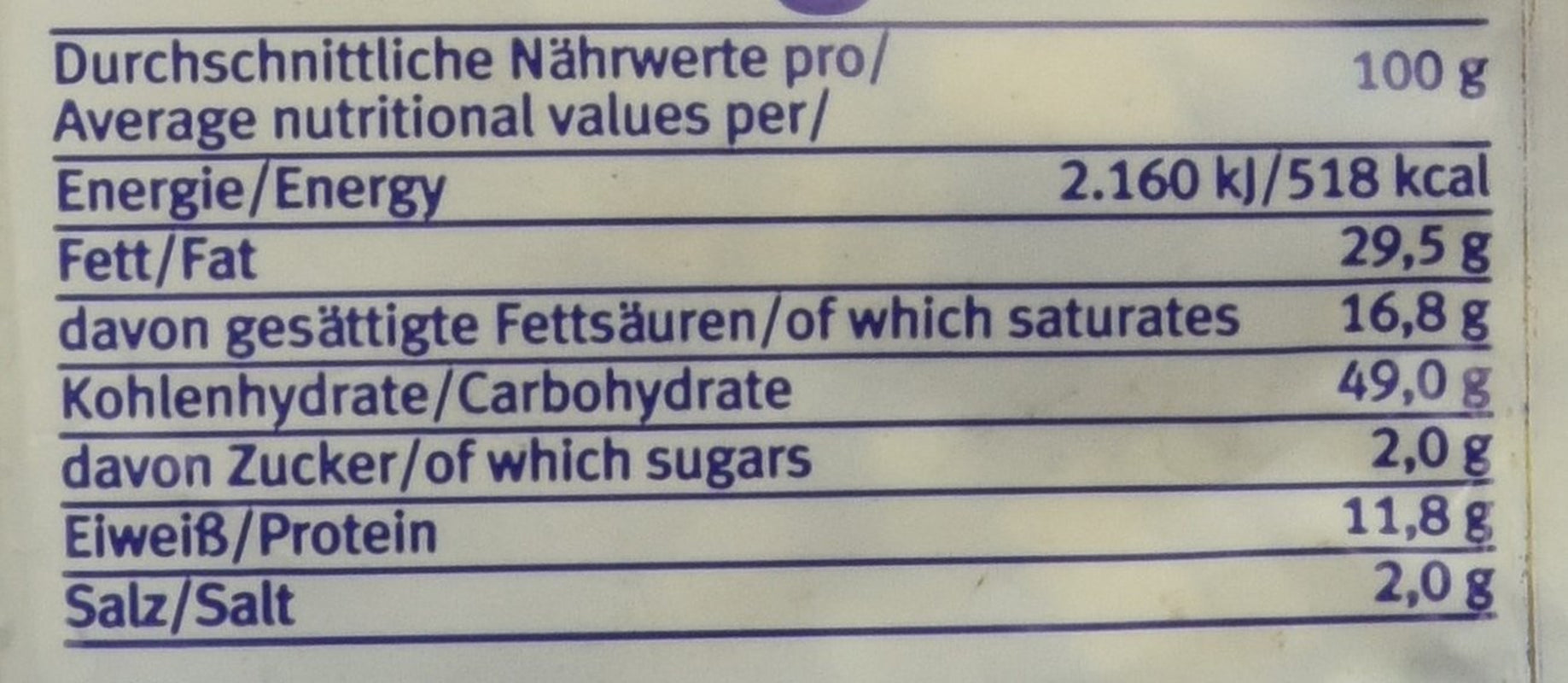 • Zutaten: WEIZENMEHL, Pflanzliches Fett (Palmfett), Maismehl,VOLLEIPULVER, MAGERMILCHPULVER, Salz, MOLKEPULVER