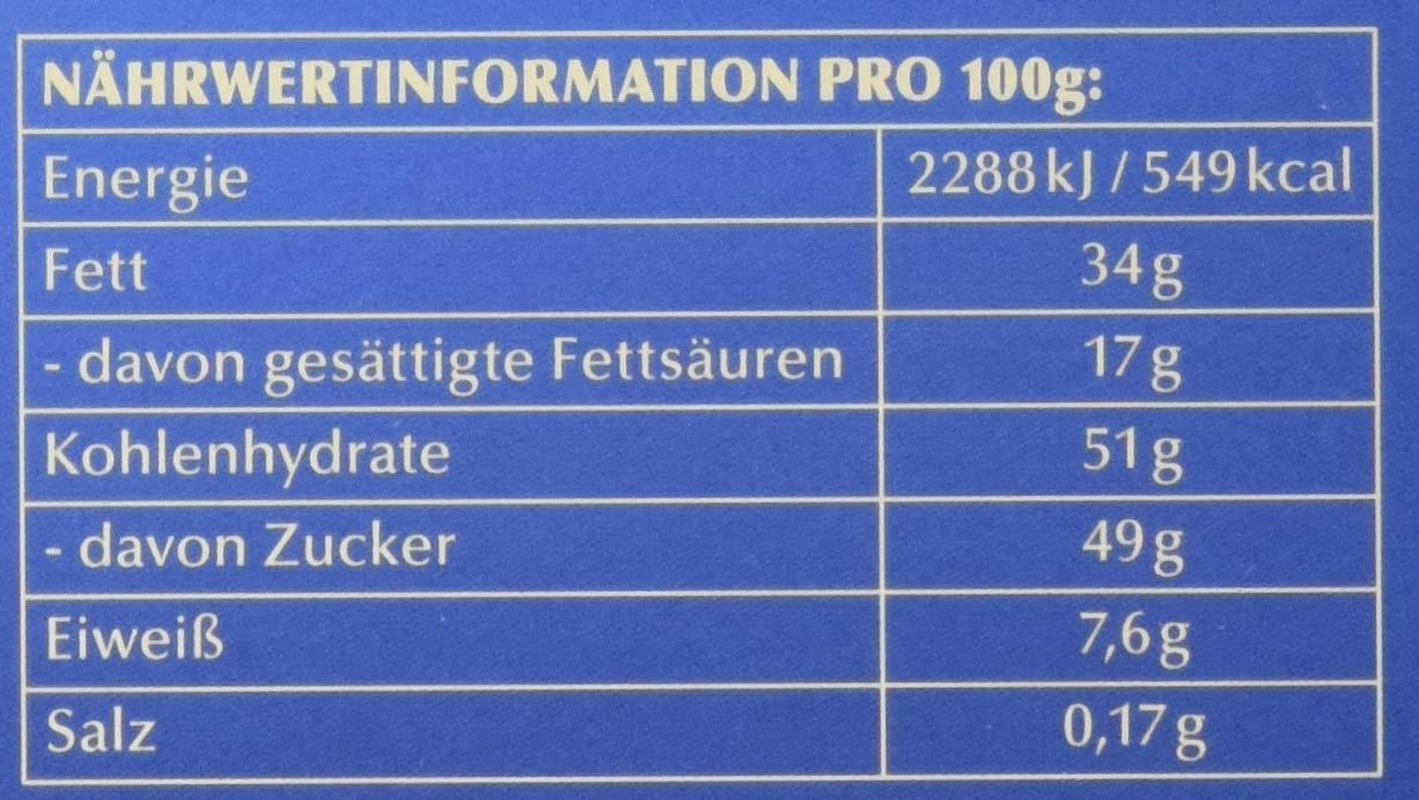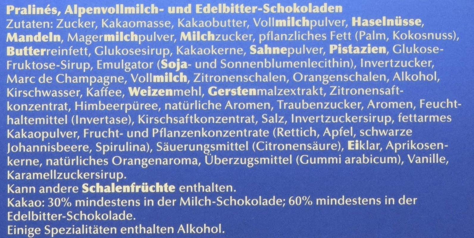 Ingrediente: zahăr, masă de cacao, unt de cacao, LAPTE praf integral, ALUNE, MIGDALE, LAPTE praf degresat, zahăr din lapte, grăsime vegetală (palmier, nucă de cocos), sirop de glucoză, grăsime UNT, sâmburi de cacao, smântână pudră, glucoză-fructoză, fistic, sirop, emulgator (lecitină de soia și floarea soarelui), zahăr invertit, Marc de Champagne, LAPTE condensat, coaja de lamaie, coaja de portocala, alcool, kirsch, cafea, faina de GRAU, extract de malt de ORZ, concentrat de suc de lamaie, piure de zmeura, arome naturale, glucoza, arome, umectant (invertaza), concentrat de suc de cirese, sare, sirop de zahar invertit , pudră de cacao cu conținut scăzut de grăsimi, acidulant (acid citric), albuș de ou, agent de glazurare (gumă arabică), natural Aromă de portocale, miez de caise, concentrate de fructe și plante (ridiche, măr, coacăze negre, spirulina), sirop de zahăr caramel, vanilie. Poate conține alte fructe cu coajă nuci.