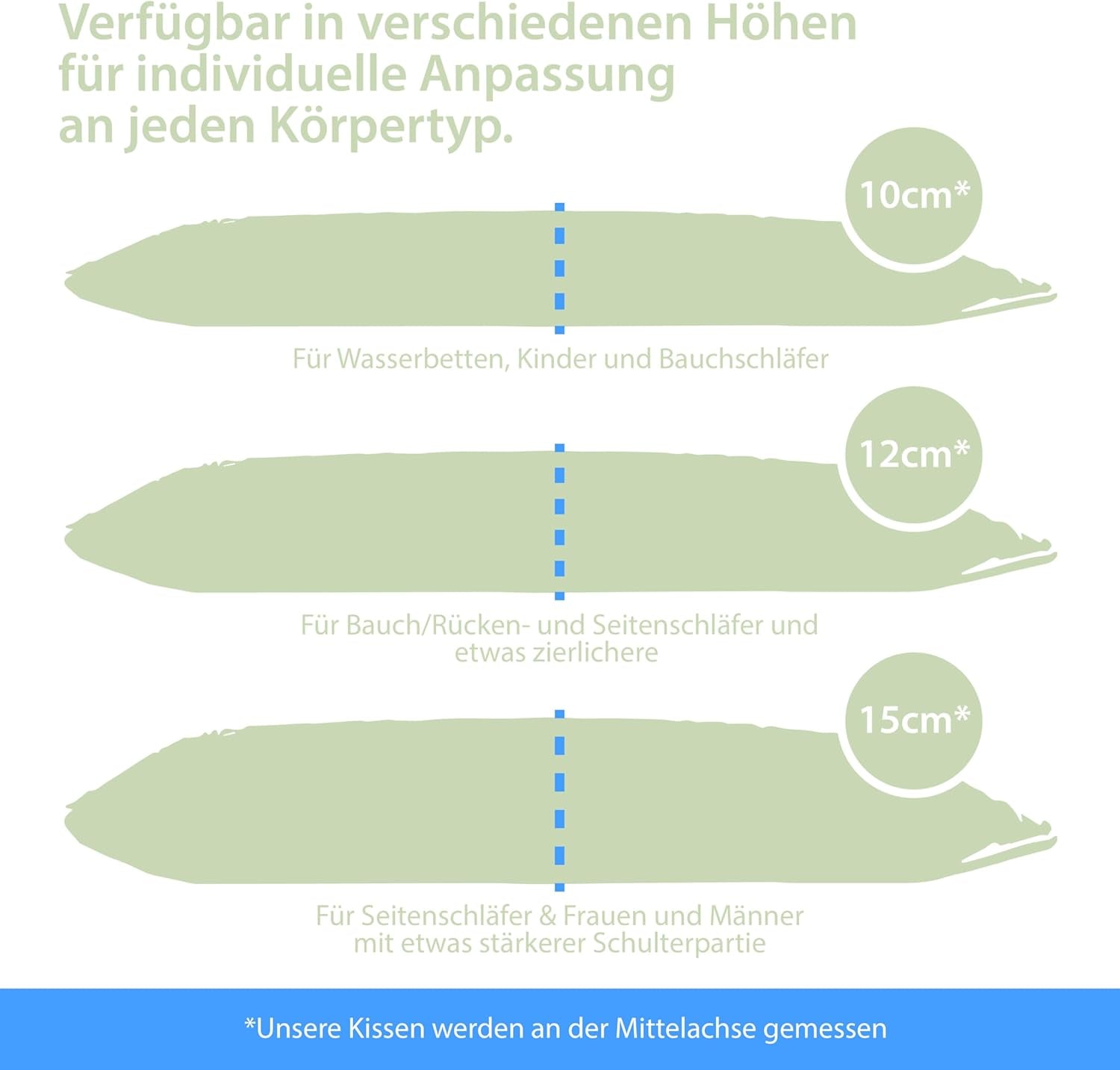 - [VERSATILITATE] Disponibilă în diferite înălțimi (10cm, 12cm, 15cm) pentru adaptarea individuală la fiecare tip de corp. Perna oferă suport flexibil care se adaptează perfect și asigură astfel un confort optim pentru toate pozițiile de dormit.