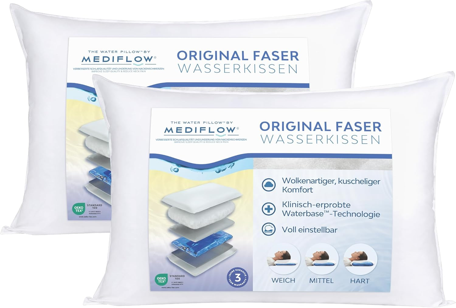 - 2 perne ortopedice de susținere a capului și gâtului cu umplutură din fibre pufoase și miez de apă reglabil, susțin somnul relaxat și ajută la durerea de gât (dovedit într-un studiu clinic); potrivite pentru cei care dorm pe spate, lateral și pe stomac