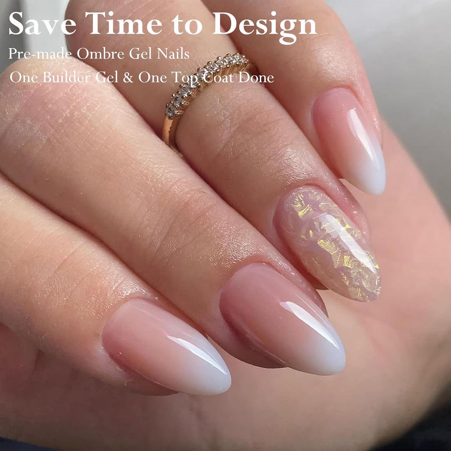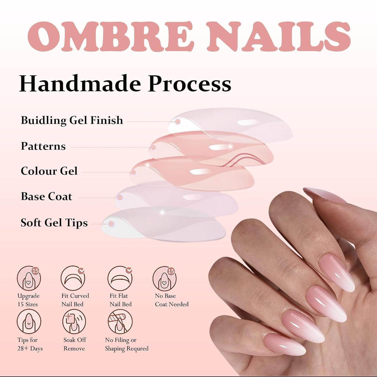 Set de unghii false - 240 de bucăți, unghii false franțuzești, pentru lipit - Design gradient alb roz, unghii artificiale, acoperire completă, gel moale, naturale și confortabile la purtare (migdală roz)