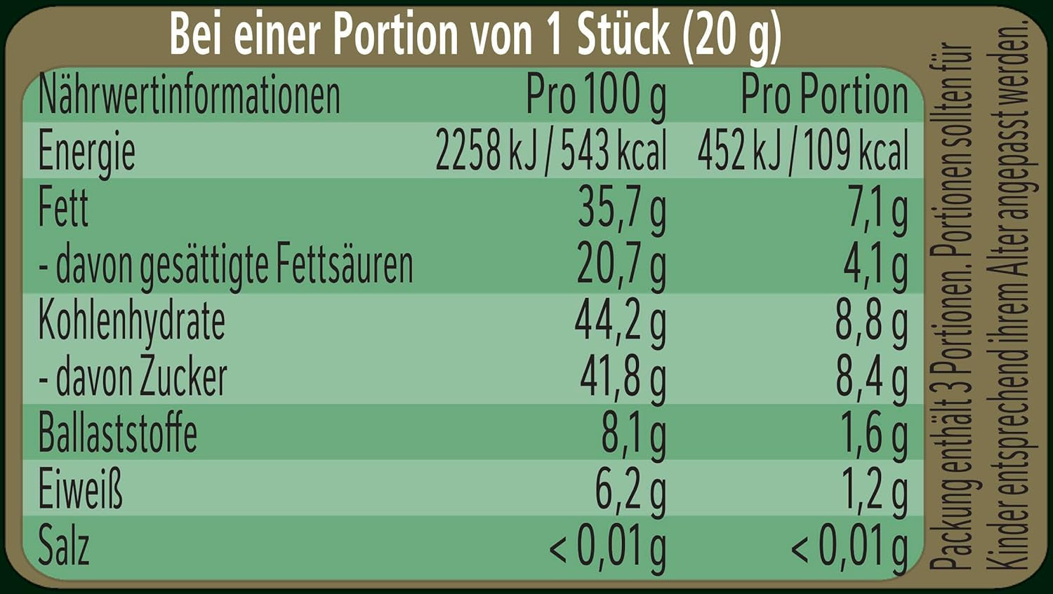 Ingrediente: 1: Masă de cacao*, zahăr, unt de cacao*, emulgator (lecitine), ulei de mentă, aromă. Poate conține: ALUNE, NUCI, SOI, GLUTEN CEREALE integrale și LAPTE. *Certificat Rainforest Alliance.