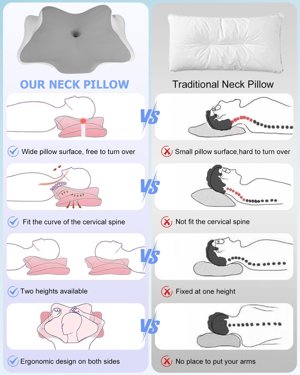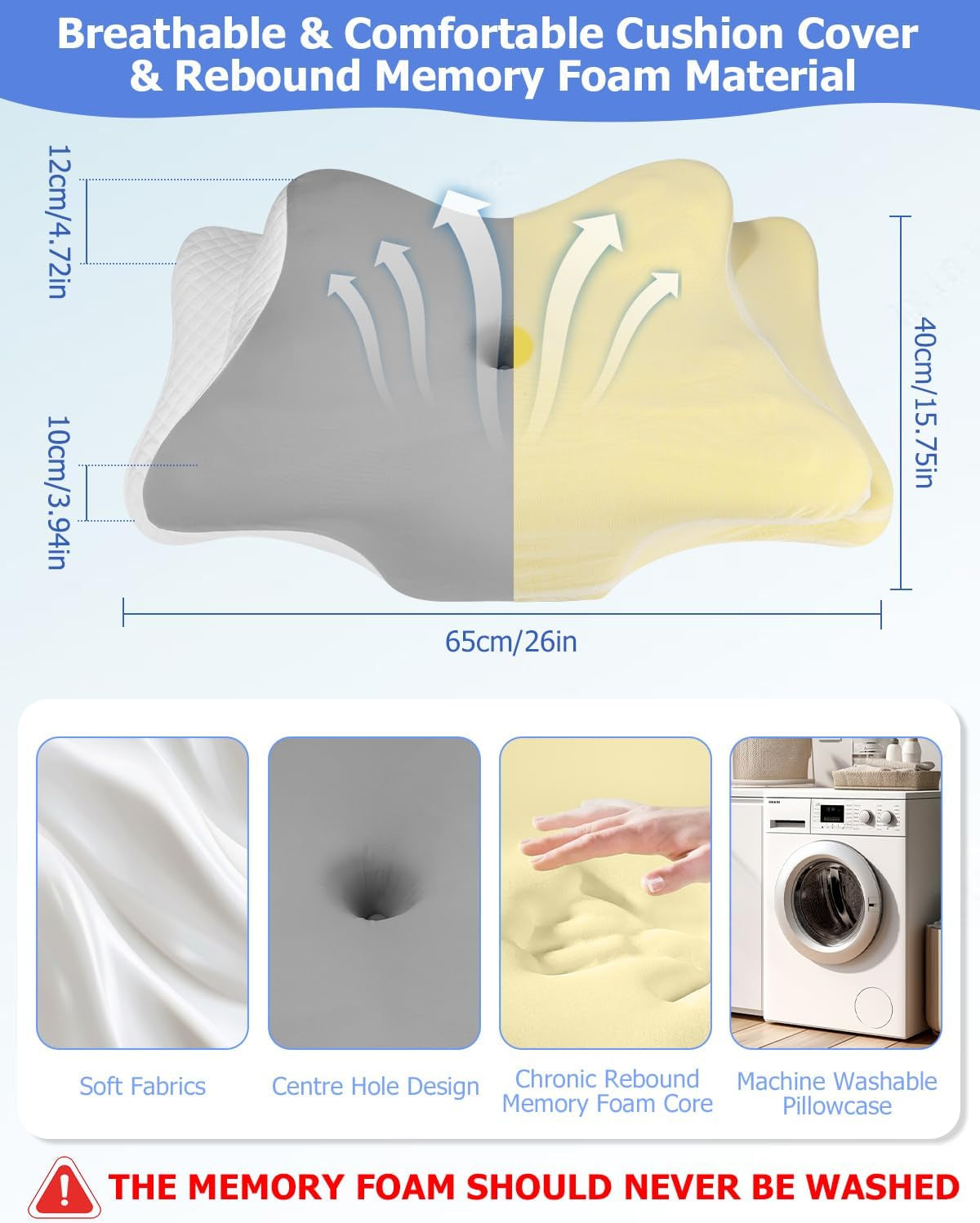 - FORMĂ NOUĂ, DESIGN ȘTIINȚIFIC: Perna ortopedică a fost proiectată cu atenție cu o nouă formă de fluture care este distribuită cu șase zone unice de contur concepute special pentru curbele naturale ale corpului dumneavoastră. Perna ortopedică combină beneficiile unei perne tradiționale și ale unei perne de contur și este potrivită pentru o varietate de poziții de dormit, de exemplu pentru cei care dorm pe stomac, pe spate și lateral