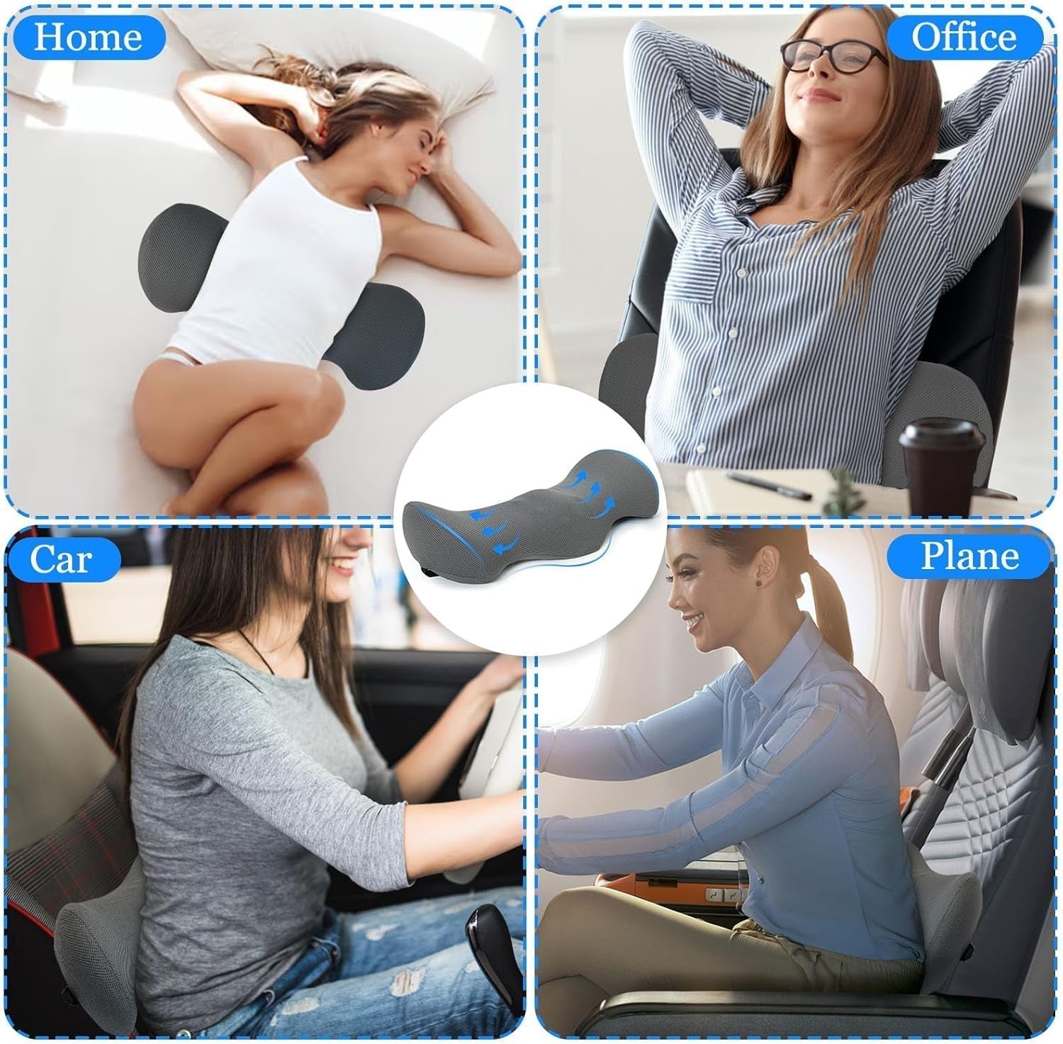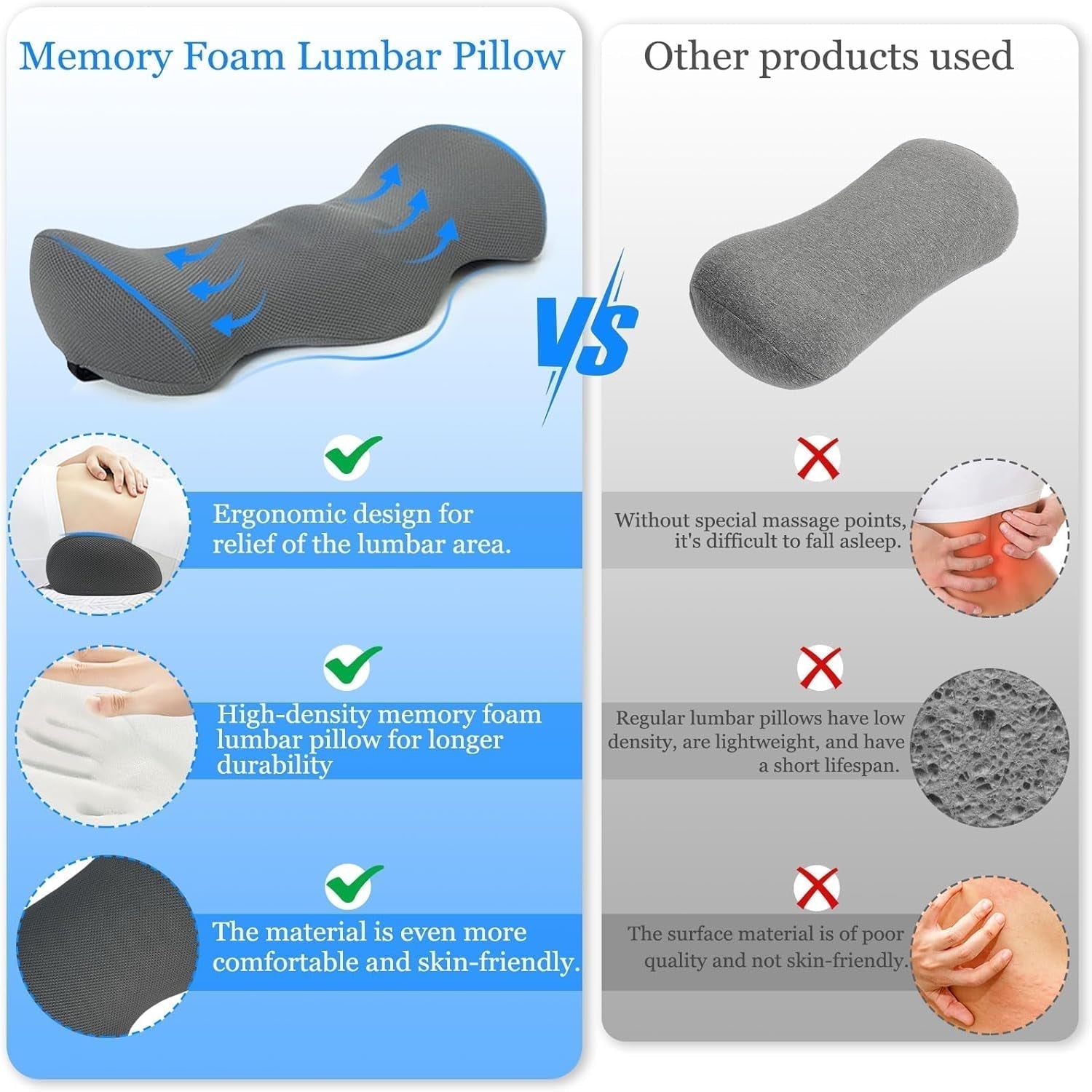 - ðŸŒ'€Pernă lombară ergonomicăã€'Perna lombară este proiectată ergonomic și are un design cu tracțiune fizică care susține curbura naturală a coloanei lombare. Umple zona din spate în care coloana vertebrală este scufundată și previne disconfortul cauzat de statul întins pentru perioade lungi. Acesta oferă confort în tot corpul. ðŸŒ'ã...ã€Material confortabil pentru perna lombarăã€'Perna lombară este fabricată dintr-o țesătură respirabilă, prietenoasă cu pielea și 100% spumă cu memorie de înaltă densitate. Își revine încet la forma sa în 5 secunde pentru a oferi o experiență de somn profund și odihnitor. Opt puncte de masaj ajută la masarea coloanei lombare. Dimensiuni: 54,5 x 24 x 11 cm.
